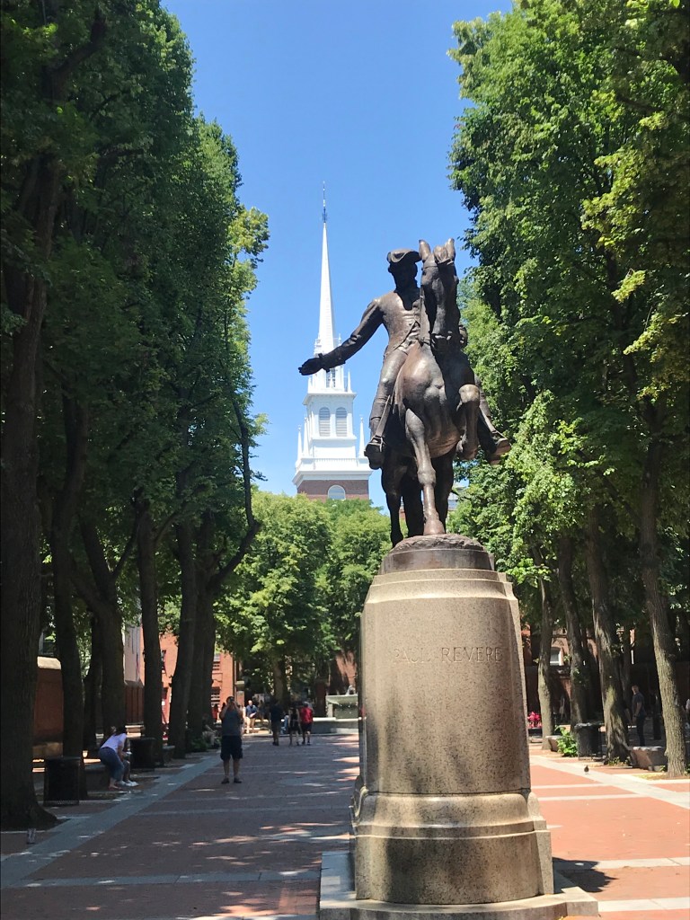 Statue of Paul Revere with the Old North Church in the background. The Freedom Trail, Boston, MA.